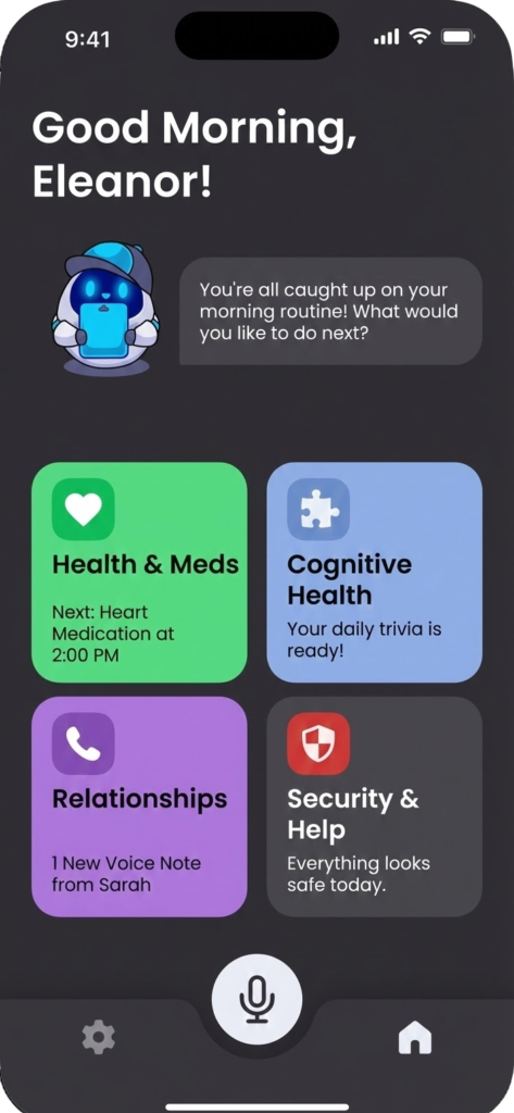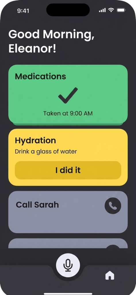 The “My Day” Dashboard: A color-coded, easy-to-read daily timeline that organizes health, hobbies, and family connections in one place.